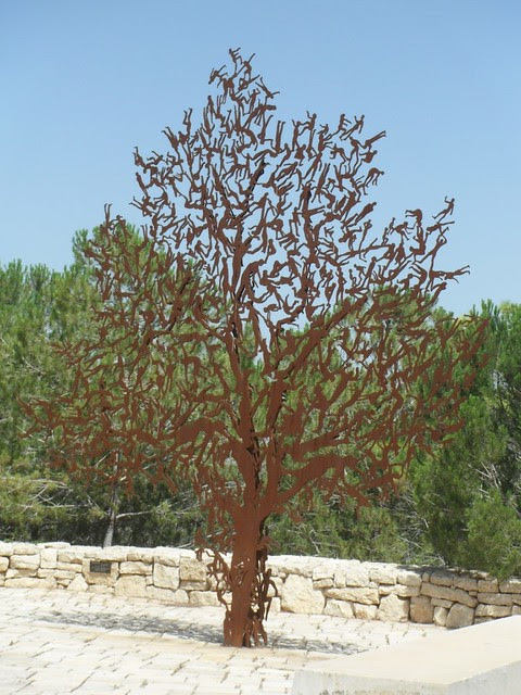 Ich gehe nicht den direkten Weg hinab zum Tal der Gemeinden, sondern gehe noch ein Stück weiter um den Berg herum zum Weg hinab zum Garten der Gerechten der Völker, wo ich diesen Baumstumpf mit seiner ganz eigenen Geschichte, die er uns erzählen will, sehe.